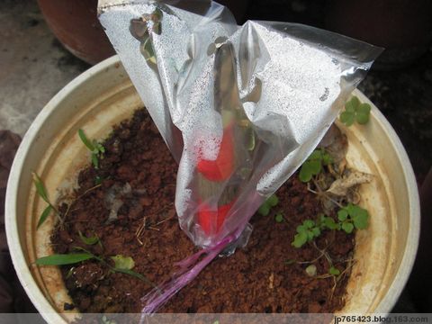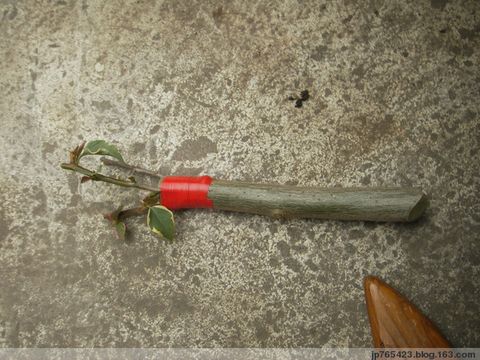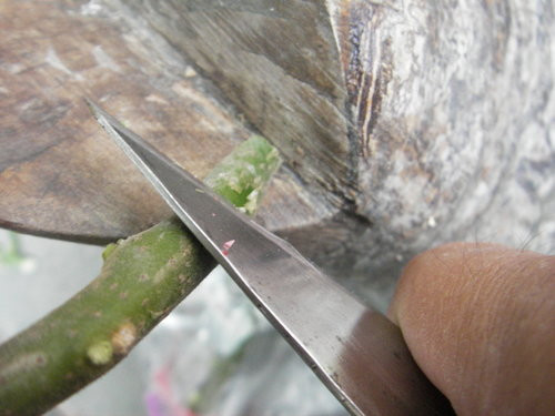 腹接完後再套袋扦插,可多芽多色腹接,從末端往基部接,可切單邊3刀接3芽或雙邊切3刀接6芽,4刀就可接8芽以此類推,重點套袋的袋子要夠長,一定要用沒用過的袋子套才不會白費工夫。