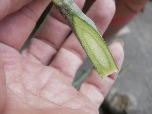 2、接穗約牙籤一般粗,二邊斜切約二公分長,對準砧木的形成層插入。