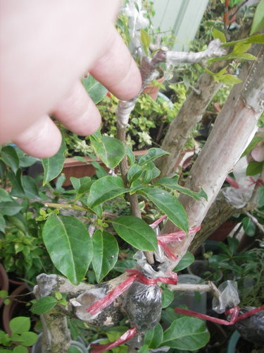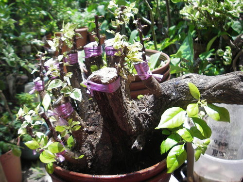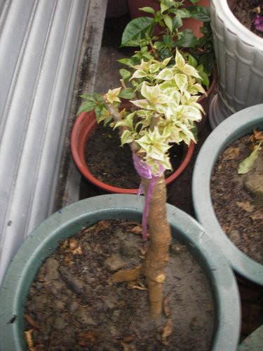 我家培育班葉日本種九重葛在接枝的第一 年有時會發現連占木一起死掉。不過第二年穖率降底很多*。檢討原因嫁接第一年過冬樹勢還不是很強怕冷,占木本身的芽都被摘除,接的芽帕冷又不長芽導致氣勢衰弱,容易死亡。改善的方法避免在越冬前3、4個月接枝,使其有強壯的樹勢越過冬天。